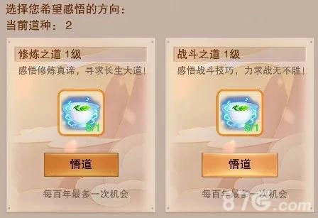 悟道战斗之道时,每次会随机提升攻击、防御、闪避、暴击、血量中的一项属性,以五次提升为一个小循环周期,每个小循环结束后,后续提升的属性数值会有所增加。每完成十次属性提升(即两个小循环)构成一个大循环,此时将获得一本《长生诀》;学习该诀术后可增加生命值,且能消耗灵气对其进行升级以提升效果。
