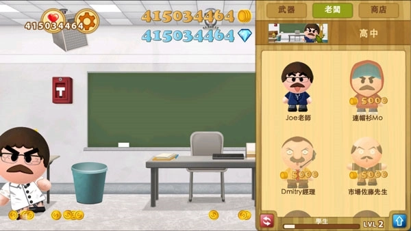 2、这款游戏在画面呈现上颇为用心,通过真实且细腻的色彩,将主角“老板”所拥有的庞大产业清晰地展现在玩家眼前。游戏的每一个关卡,都围绕着老板的不同身份场景来设计——既有规规矩矩的教室,也有充满欢乐氛围的游乐场,此外还有快餐店、电玩店等多种不同场景。而老板还是大家熟悉的那个模样,像只泄了气的皮球似的,站着时摇摇晃晃、稳不住身形,当玩家揍他的时候,他还会发出贱兮兮的叫声,玩起来实在是超级有意思。