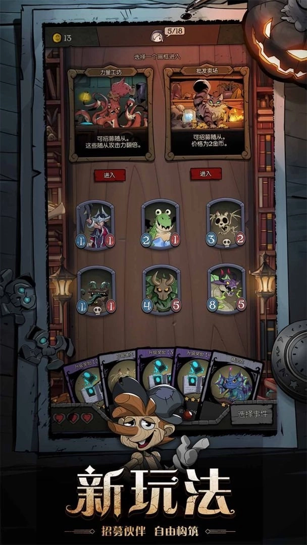 游戏以卡牌为表现形式,融入了Roguelike的随机探索灵魂——所有可探索内容均通过“随机事件翻牌”触发,这让通关过程中的运气成分更具张力。值得注意的是,每次仅能保留3种事件选项,玩家常需在取舍中推进:比如遇到商店与铁匠铺时,必须二选一才能继续前进,且选择一旦做出便无法反悔。