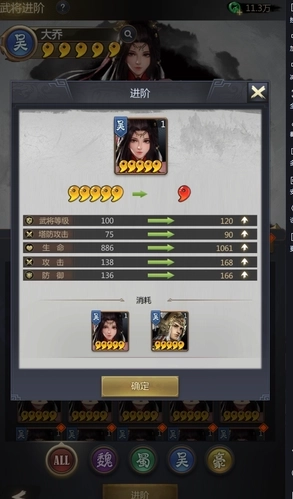 武将进阶可以提高武将的等级上限、星级、自身属性。