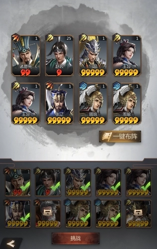 在战斗前,主公需要布置一下上阵的武将,最多选择上阵8个武将,可以选择重复的武将上阵。主公可以自由搭配武将,但是要注意武将之间的配合联动,合理搭配单体型、群攻型、控制型武将能让战斗事半功倍哦!待主公熟练后可以选择“一键布阵”的功能。