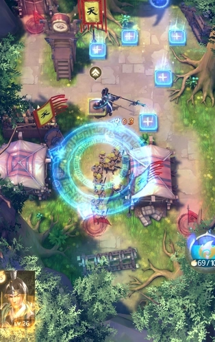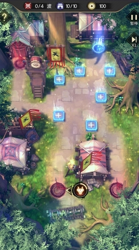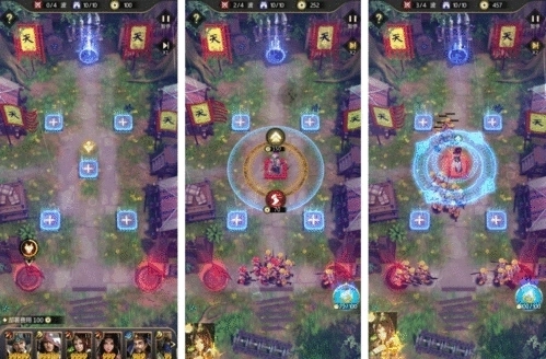 在塔防玩法中,地图里红色圆形区域为敌人出兵点,蓝色圆形区域为主公的防守点,我们唯一的目标就是防止敌人通过防守点。一旦敌人通过防守点,即为失守,主公失守个数小于10,即为通关。通关后的星级,是根据主公关卡的失守个数来判定,0失守数即可获得满星,如果出现失守,则会根据失守个数扣除相应的星星,不过无论主公获得多少星星,都可以得到关卡奖励。