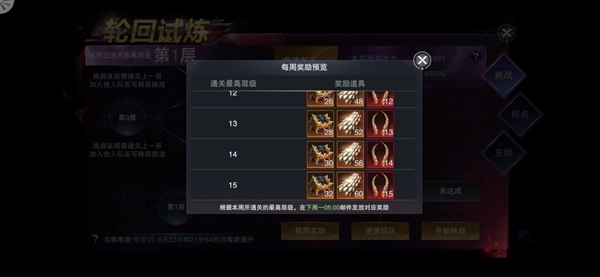 系统记录玩家一周之内通过的最高层级,发放相应层级的周奖励,最高15层可获得32个轮回装备箱、15个圣龙之角和60个圣龙之臂的奖励,奖励每周一更新结算。