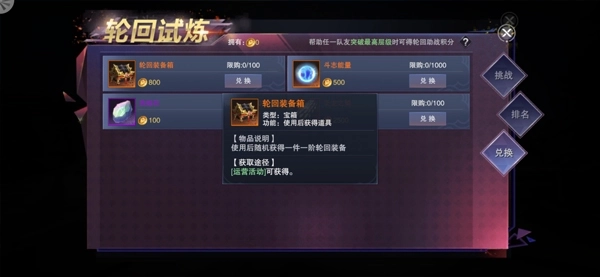 可在“轮回试炼”兑换界面换取轮回装备箱、圣龙之鳞。