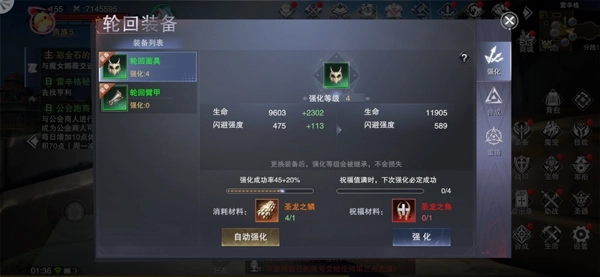 强化需要消耗圣龙之鳞,也可加入祝福材料。圣龙之角,增加20%强化成功率;圣龙之心,可使强化失败后装备强化等级保持不变。