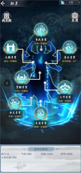 驭灵是以镶嵌的形式增加玩家的属性,其中玩家的境界越高,能够解锁的星宫越多,星宫越多镶嵌的“灵”越多,属性越强!