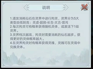 每次拘灵需要耗费仙石,可以随机获取不同的灵体,也能获取灵魄,用于兑换高级灵体或灵体经验,在灵境中查看