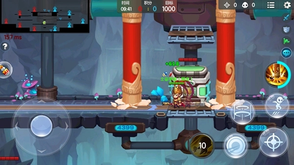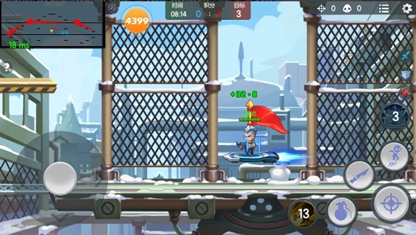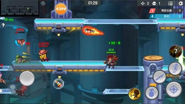 在战斗中我们一共有6个按键,分别是手雷,跳跃,开火,闪现,大招,近战攻击。游戏中我们可以看到自己的血条与敌人的血条,游戏人物移动的频繁,我们需要做的就是最短的时间击杀最多的对手。