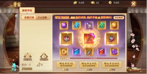 装备寻宝可以获得基础材料、经验药、属性丹、宝石、高阶高品质装备和绝版神兵利器,高品质的戒指和手镯只能通过寻宝获取,所以上仙们要好好把握机会,佩戴戒指和手镯可以和其他上仙拉开不小的差距。每次寻宝需要消费对应数量的宝藏钥匙,宝藏钥匙可以从商城购买。