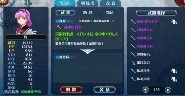 角色的武器熟练度可通过玩家消耗材料来提升,不过该熟练度仅在角色装备合适武器时才会触发。哪些是合适的装备呢?图中右侧带有记号的就是。另外要注意,装备一般分为STR和ATS两种类型,而且武器存在装备次数限制,所以给角色佩戴武器时,可一定要留意武器的属性呀~