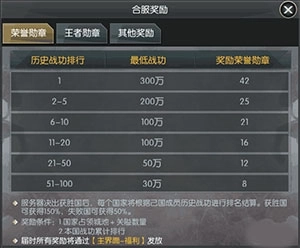 1、战胜国在当前服务器统一的时候会根据战功排行榜额外获得大量轮回勋章、王者勋章。