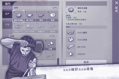 1、采完蘑菇后,我们回庇护所,走到庇护所的厨房位置,点击“刀叉”的标志就能制作食物。