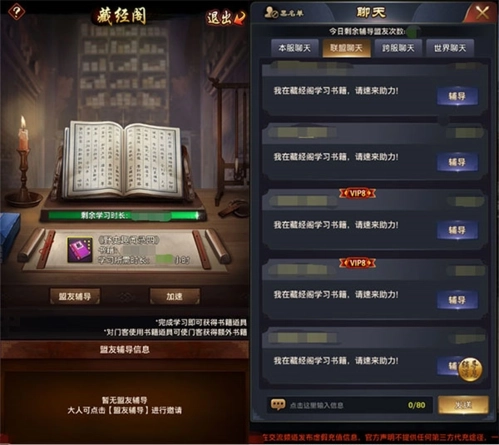 3、对了,对了!藏经阁中还准备了“明盏”、“明烛”、“明灯”等加速道具方便大人快速学习!如果大人邀请盟友前来助力,每名盟友可以减少30分钟学习时间!!每天3次,还不快约上盟友一起学习进步!!