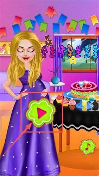 1、走进粉紫色的房间,看到孕妇角色时,点击下方绿色花瓣样式的按钮,右侧能看到音乐图标和摆放着美食的桌椅场景。