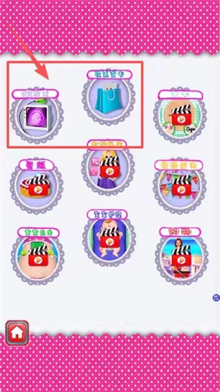 2、进入粉色波点的界面后,点击九宫格样式的功能图标,可从中选择“梦幻衣橱”“购物袋”等功能选项;界面左下角的红色方块为返回按钮。