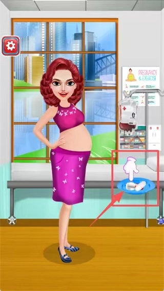 3、在医院病房场景中,当看到那位红发孕妇时,点击屏幕右下角的蓝色托盘区域。另外,左上角那个红色齿轮图标是游戏的设置按钮。