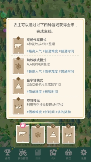 3.玩家可通过体验不同类型的纸牌游戏赢得金币,再用这些金币解锁农庄的更多区域。