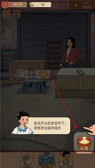 6、新店开业当然少不了招揽客人,点击右下角的鼓即可吸引客人。