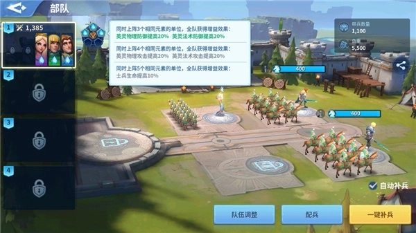 5、丰富的多种士兵,战士,远程,骑兵,重盾兵等待玩家的合理搭配,自由选择。