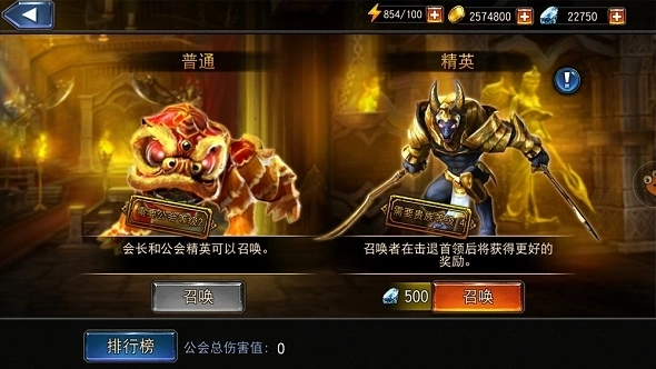 召唤成功后,公会中成员需消耗体力进入副本战斗,高级首领更有钻石奖励