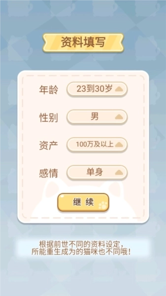 《是猫就活100岁最新版》是一款以猫咪作为主角的休闲模拟经营类型的手机游戏!在游戏里面小猫咪的人生重新开始了,你们做出的所有的选择都可以决定它们的人生走向,你们会怎么决定呢?是猫就活100岁游戏从猫咪的角度看世界、做选择,感受不一样的猫生。玩家在游戏里可以选择参加各种冒险,为猫咪获得新的技能点,还可以选择合适的猫伴侣,展开新的生活,甚至可以选择好好修炼,活到百岁做个灵猫,不管玩家想做什么,在游戏里都可以实现,一起来体验属于自己的猫生吧!