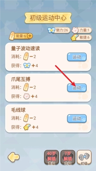 4、随着年数的增加,我们会解锁各种玩法,例如这里通过运动来增加一下力量。