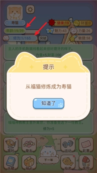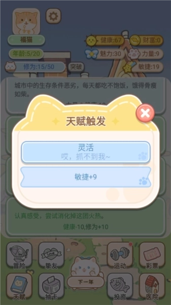 2、天赋与随机事件:在游戏中,玩家需要为猫咪选择天赋,这些天赋将影响猫咪的成长和生存能力。同时,游戏还设置了丰富的随机事件,如天气变化、疾病侵袭等,玩家需要灵活应对这些事件,帮助猫咪健康成长。