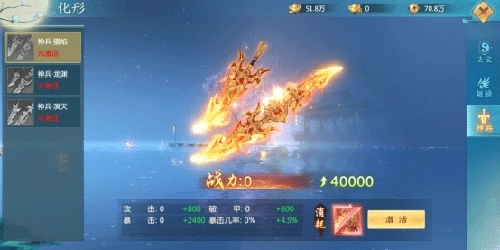 海量暴击属性;激活神兵外形可以按百分比提升暴击属性,并获得专有的外形显示。