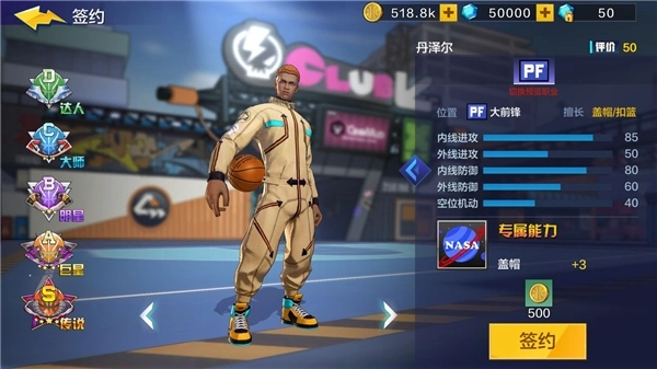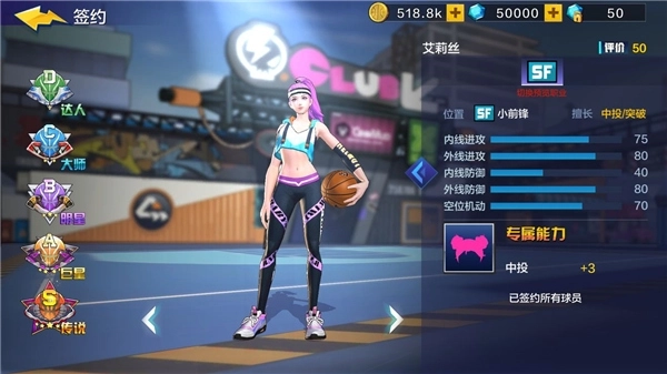 篮球手需要通过提升训练阶级,可解锁相应技能和技能栏(技能栏用于装备技能)