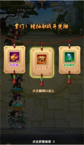 挑战奖励:每次挑战除了获得掌门经验。银两外,还可以获得名望,胜利获得50名望,失败获得30名望。挑战胜利后还有翻牌机会,随机获得奖励中的1个,包括银两、元宝、刷新令、装备碎片、弟子魂魄等各种资源道具。