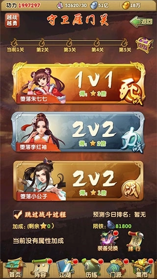 江湖关卡怪物有普通小兵(每日免费挑战99次)、精英守卫(每日免费挑战10次)、Boss(每日免费挑战5次)3种,玩家成功击杀这些怪物,可通关对应的关卡,可产出大量的资源和道具奖励,奖励包括有掌门经验、弟子经验、弟子经验道具、装备碎片、弟子魂魄等奖励。
