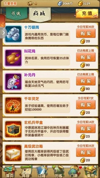 另外一个必买的就是灵芝,它一直都属于对属性提升较大且比较稀缺的道具,因此看见就不要放过哦!而修炼丹、银两、突破丹、培养丹之类的,根据当前需求以及侠魂、元宝拥有量,来决定购买情况,从性价比上来说这里算是比较值的。
