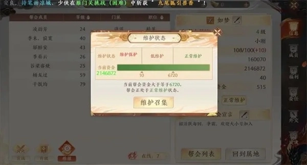 帮主需要经营帮会,维持帮会的资金在正常维护的范围内,通过完成帮会任务。纳贡祈祥、帮会运镖,会获得帮会资金与帮会军资。