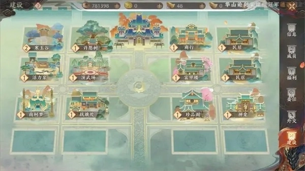 7、帮会建设可以在帮会-建设查看升级帮会的建筑,不同的建筑提供的功能不同。