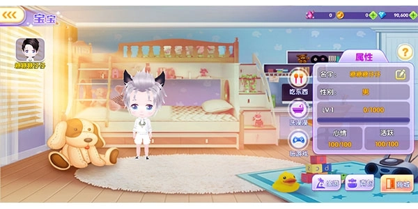 其中吃饭增加宝宝的经验值、玩游戏增加宝宝心情值、洗澡增加宝宝活力值。目前宝宝最高等级5级。