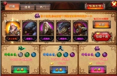 强而有力的小伙伴们(神将)途径最快的方法当然是抽奖,抽奖共有三种品质,地、天、仙。每隔一段时间就可免费抽取一次,激动人心的时刻当然要先洗洗手在来抽啦!