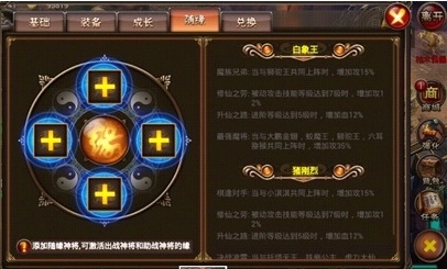 神将可以升级、穿戴装备、进阶、缘分搭配、培养每项功能都会大大提高神将的属性(如攻击、防御、血量等等)