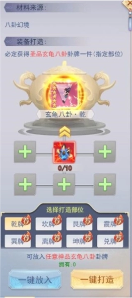 八卦牌可以通过打造提升品级,任意5件低品级的同类八卦牌即可打造一件高品级八卦牌。低阶打造只消耗八卦牌,高级打造需要消耗指定道具升星石。八卦牌分解与八卦牌部位无关,只与八卦牌类别以及品级有关。