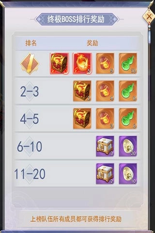 4、伤害排名奖励:该排行的结算以队伍为单位,没有组队的玩家则自己造成的伤害视为队伍伤害。