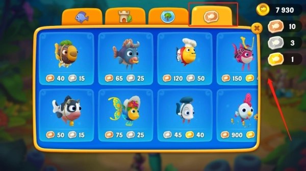 本作的三消部分与目前市面上大多数三消游戏相似,除了三个宝石消除外,四个、五个、T字等花式消除都能产生特殊宝石,触发特殊效果,形成大面积消除。在三消关卡中达成要求,就能通关并获得金币,有了金币就能购买各种鱼和摆设了。