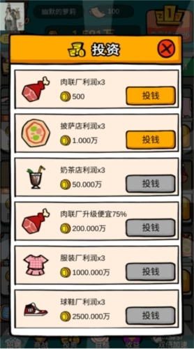 只要你有优秀的战略眼光,投资工厂,招牌人才,企业...10亿对你来说确实是个小目标。但我们的目标不止于此。总有一个人想成为首富!来啊!在这里,你可以投资建厂。不同工厂的投资价格不同,收益和产生收益的时间也不同。工厂的级别越高,赚的钱就越多。升级要花钱。