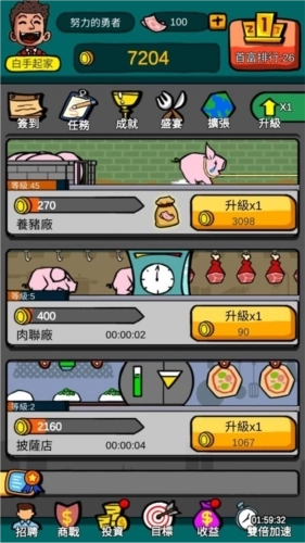 1、开个养猪场,披萨店...随着玩家财富的上涨,能够建设的厂子会越来越多。期间你可以通过升级,来提升各厂的等级,等级越高,赚钱的速度越快。