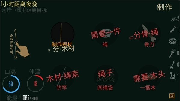 4、游戏开局狂奔到湖泊,搭建帐篷伐木点火,切割绳子做鱼竿,牛肉全部切成牛肉干,不要吃,(其他东西全部吃掉)全部用来钓鱼;
