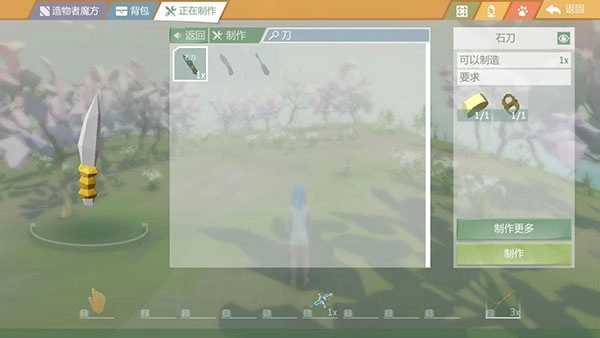 制作完简单的“草绳”,返回上一级界面,加上1块燧石就可以轻松制作出一把石刀啦!怎么样?是不是非常简单呢?通过上述示例,小伙伴们不妨大开脑洞举一反三,继续拾取地面上的“木棍”、“石头”,继续合成其他工具。