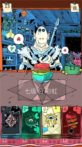 前来买药水的顾客所提出的要求就一个,那就是药水中的成分必须要有某种颜色的元素,也就是对应某种颜色的卡牌,所以在配置的时候必须满足顾客的要求。此外这里还有药水效力一说,这就牵扯到卡牌的数值加减了,在卡牌下方的左右两边和底部会出现某种颜色标记,意思就是如果你能够在对应的方向放置对应颜色的卡牌,那么就会获得数值也就是药效加成,也就是说在保证顾客所需元素不缺失的前提下,通过合理的排布来提升药效才是玩家最应该追求的,当然,药效越高,顾客给予我们的回报也会越多。