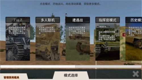 遭遇战:俩支装甲部队的遭遇会战。可选择对战年代与地图,玩家可重生,可正常获得战斗收益;