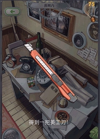 2、进入桌面,点击笔筒得到美工刀,桌子的第一个抽屉是什么都没有的,点击左下角的道具栏,选择美工刀,点击墙上SAVEME的画,用美工刀割过去,得到双子座硬币: