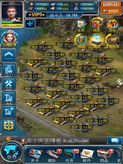 矿场,你能获得的所有资源,至少有一大半是来自于矿场,由于只需升级无需管理的特性,重要性更高于造船,矿场中铁矿产量最高、其次铝矿、最后钛矿,现在比较流行的比例是7铁9铝13钛,这样的比率比较均衡,但是我个人建议采取铁铝各10,剩下造钛,船在外只需采钛矿较为简单。