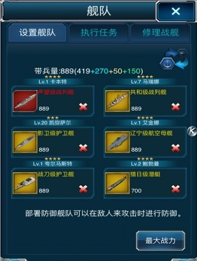 除了关卡和世界地图的战斗之外,作战中心囊括了一切战斗类系统玩法的设置所在,当中包括基地防守部队设置,安排好守家的海战力量,才能安心搞经济搞发展!而战损部队的修理也同样重要,是作战中心一大附属功能,避免将有用的战斗资源浪费,然后做出最合理的维修再投入战场!