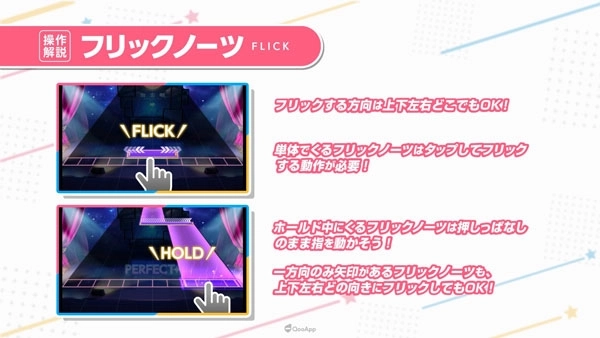 关于滑动方向的紫色FLICK音符,除极少数情况下有指定方向,基本上所有FLICK音符可以往任意方向滑动。而长按的青白色「HOLD」音符,即使最一开始MISS,只要途中有按到最后也没有问题,更可更换按住的手指。